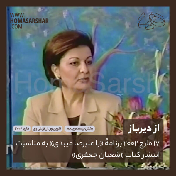 از دیرباز-بخش بیست و پنجم-۱۷ مارچ ۲۰۰۲ برنامهُ «با علیرضا میبدی» تلویزیون انآیتی وی – لُسآنجلس@homasarsharآگوست 19, 2023«از دیرباز» بخش بیست و پنجم در سالگرد ۲۸ مرداد به بخشهایی از مصاحبه با علیرضا میبدی ... بیشتر بخوانید