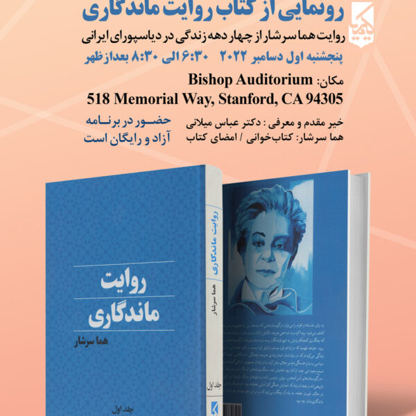 رونمایی که کتاب روایت ماندگاری@homasarsharنوامبر 24, 2022A Narrative of Endurance Date Thu December 1st 2022, 6:30 – 8:30pm Event Sponsor Hamid and Christina Moghadam ... بیشتر بخوانید